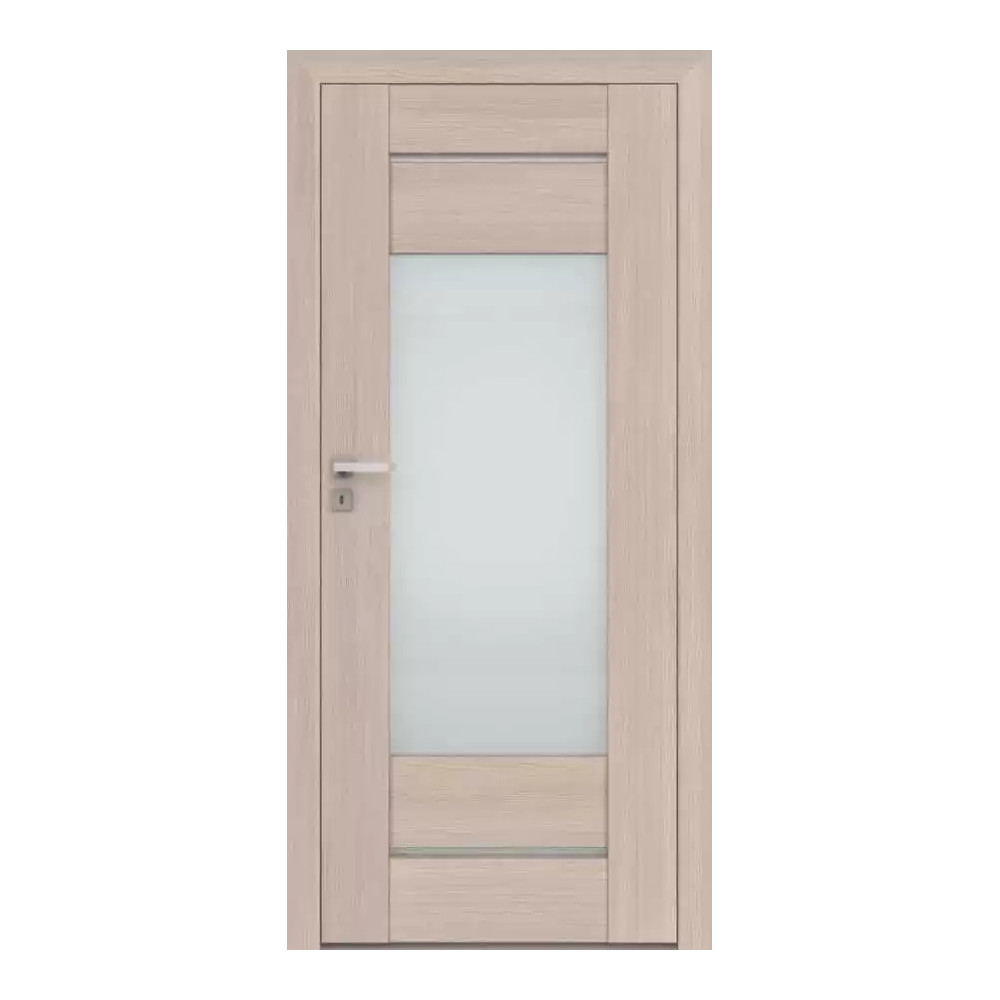 Skrzydła ramowe wykonane są w całości z płyty drewnopochodnej. Grubość ramiaków pionowych wynosi 40 mm, a szerokość wynosi 160 mm, co zapewnia trwałą konstrukcję skrzydła drzwiowego. W drzwiach zastosowano szybę MAT DRE o grubości 4 mm oraz płyciny płaskie HDF oklejone srebrnym laminatem.