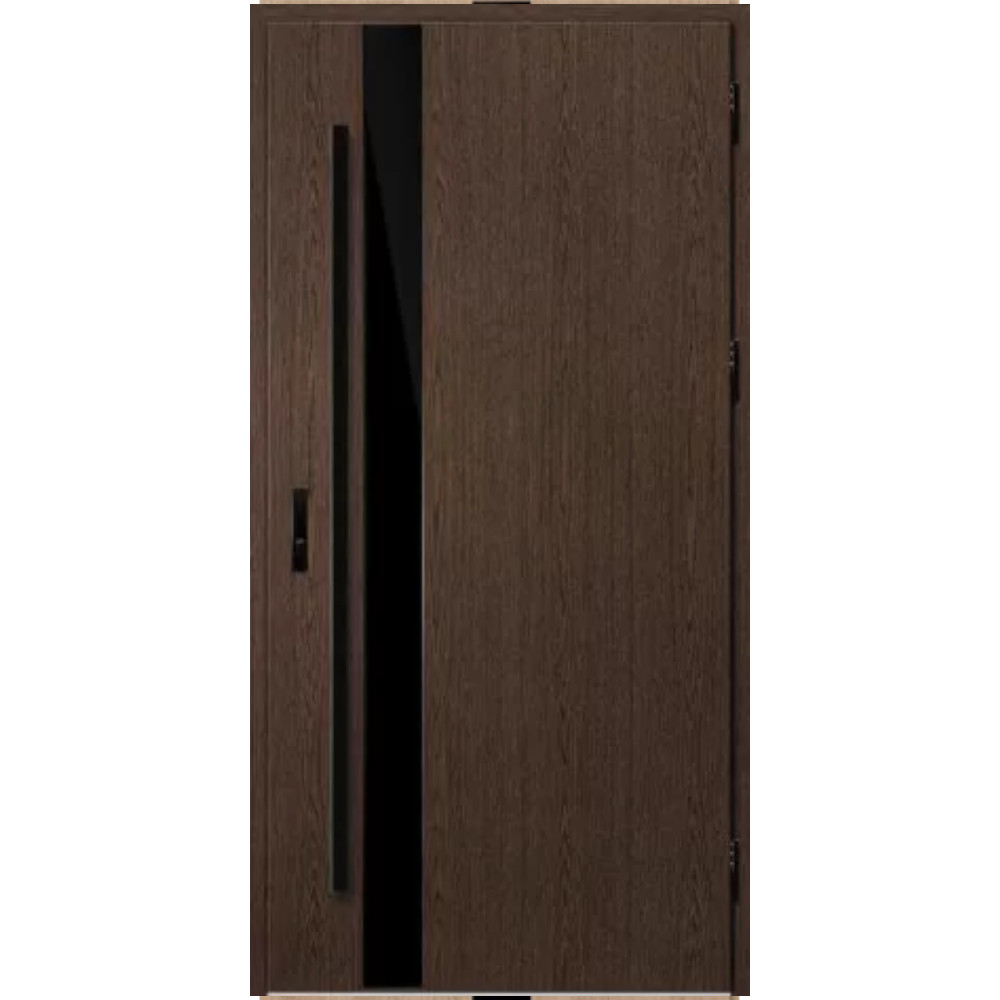 Drzwi wykonane z blachy stalowej, zabezpieczone okleiną PCV, która odznacza się wysoką odpornością na zmienne warunki atmosferyczne, promieniowanie UV i uszkodzenia mechaniczne. Idealne do nowoczesnego budownictwa. Wstawka szklana lacobel black zlicowana z powierzchnią szkrzydła.